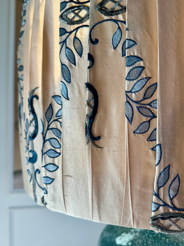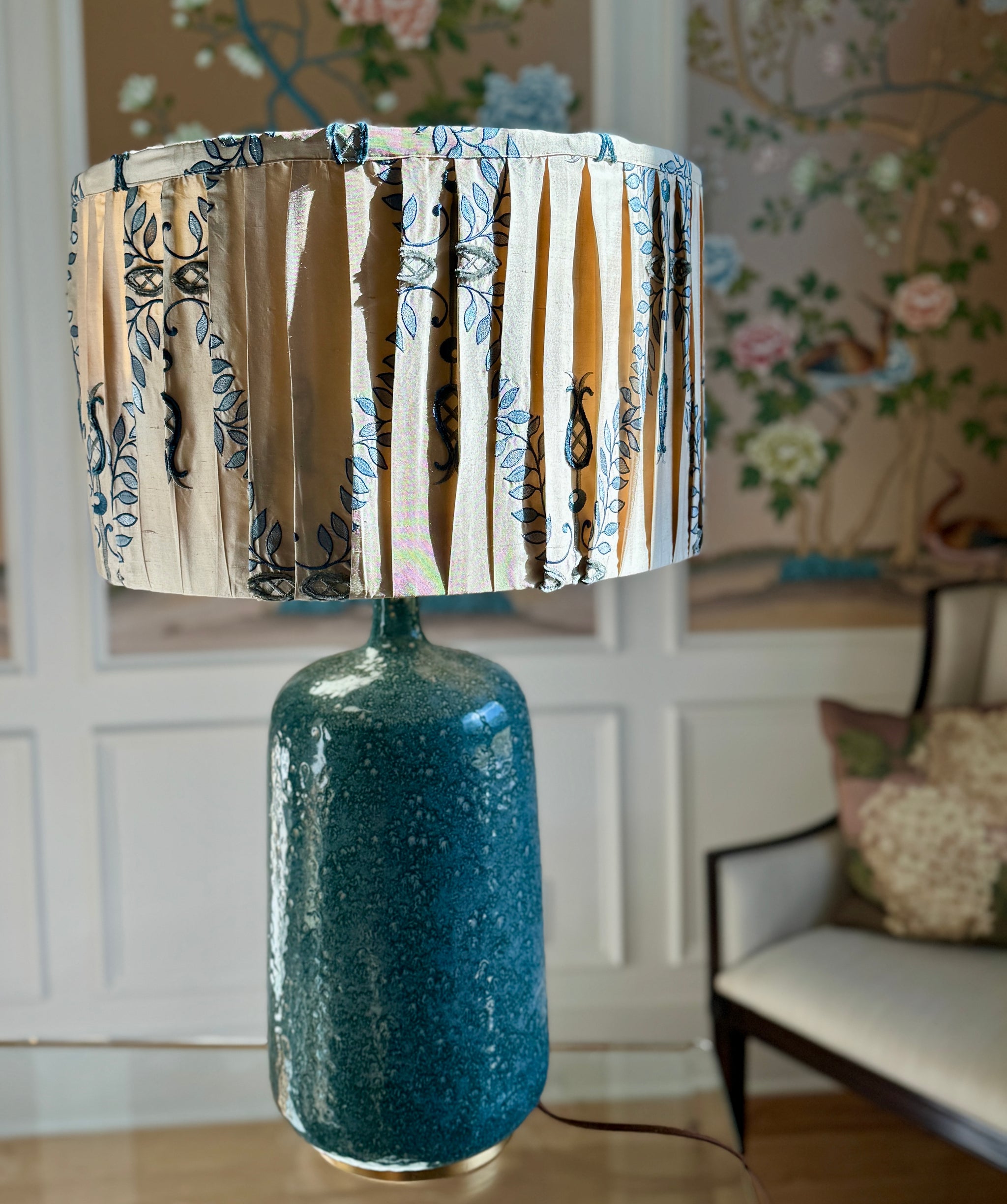 Handmade Scalamandré silk pleat embroidered lamp shade in ivory atop vintage Aerin Lauder blue ceramic base table lamp, finished with hand-applied reactive glaze.