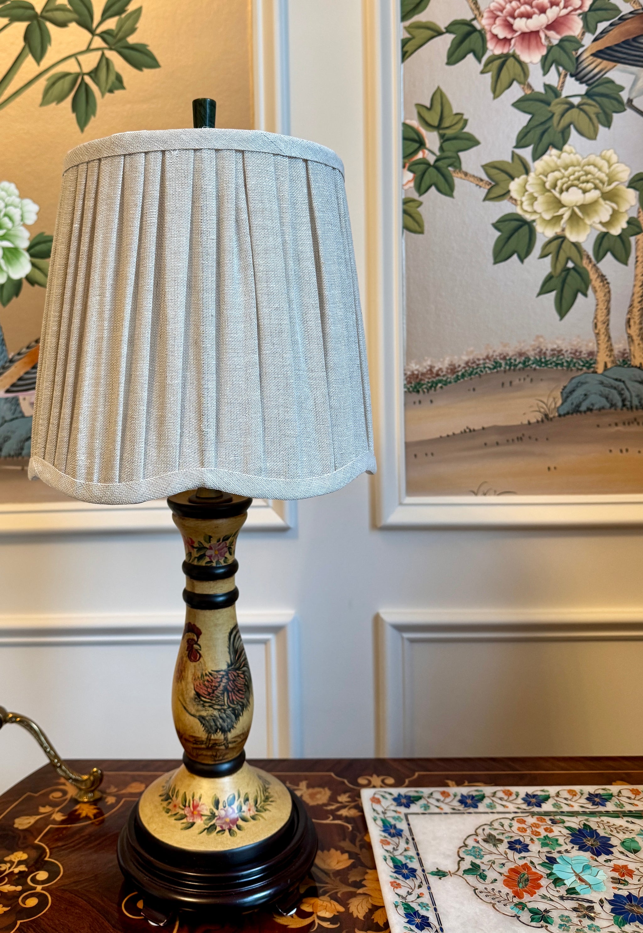 Wooden Rooster lamp with natural linen scallop lamp shade and green stone finial.